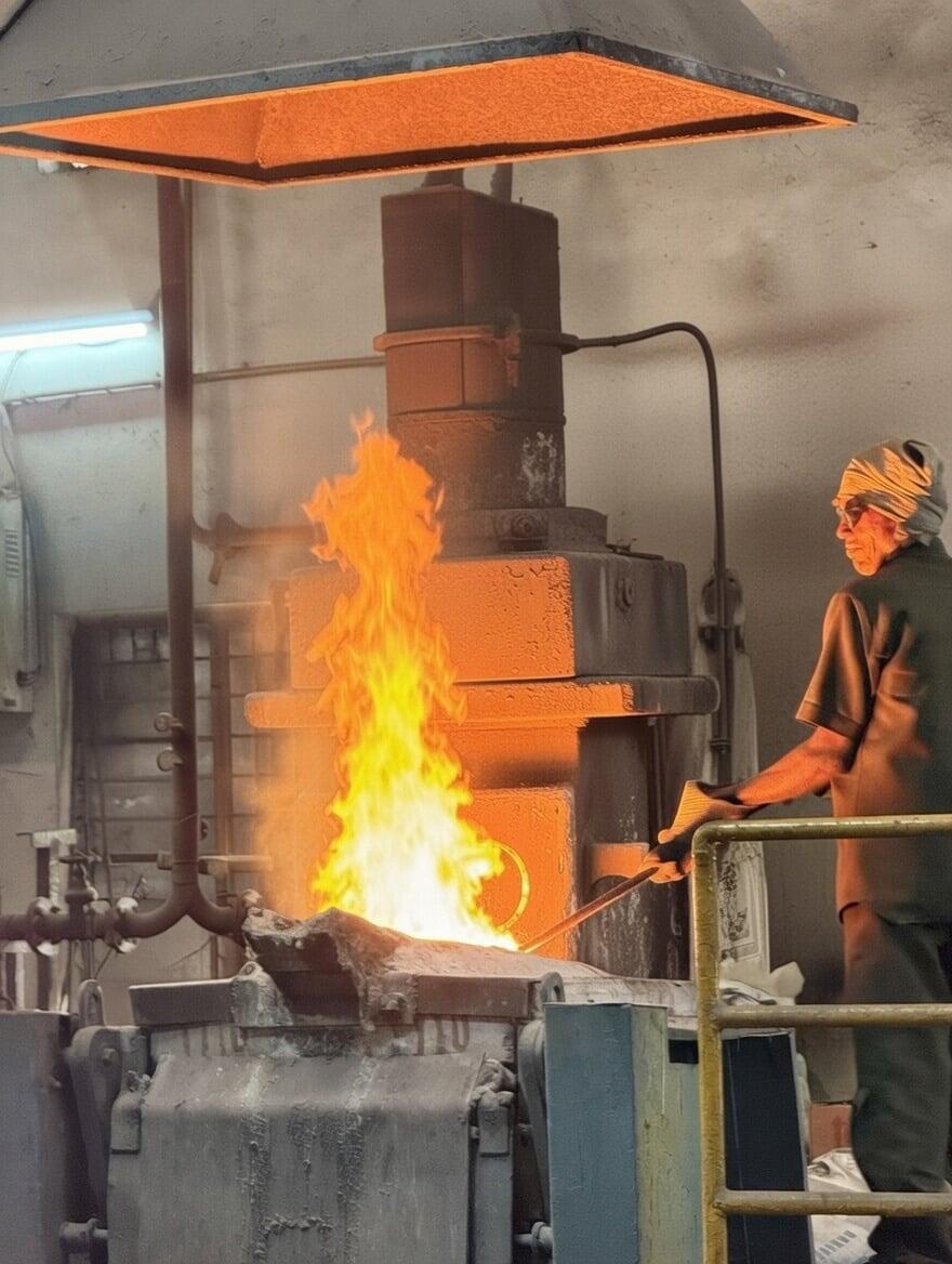 150-ton capacity in-house foundry producing grey and ductile iron castings up to 25 kg with controlled metallurgy, induction melting, and mechanised sand preparation.